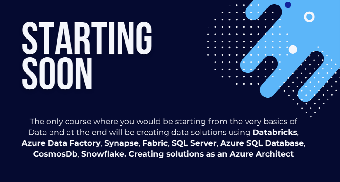 300+ hours of learnings, including everything you need to know to become Azure Data Architect/Azure Data Engineer. Covering topics like Data Engineering Foundations, Azure Basics to Architect, ADF, Databricks, SQL, SQL Server, Snowflake, CosmosDb, Azure SQL Database, Fabric, Synapse, DWH concepts, Performance Tuning and everything else you may need + 4 Realtime based projects.